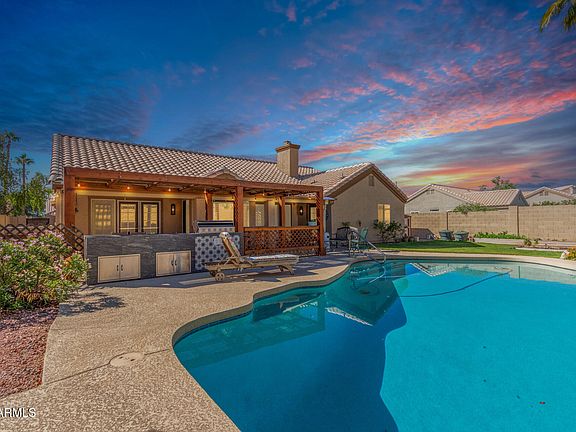 Rare 4 bedroom, 3 full bath single-story home on large corner, cul-de-sac lot in Mountain Park Ranch near South Mountain. Hardwood floors in the main living spaces, bamboo floors in the office/living room space. Vaulted ceilings & French doors in family room & separate, open formal dining area. Kitchen features granite countertops, stainless appliances, pantry, & breakfast area. Main suite includes French door exit to patio, granite counters, double sinks & separate garden tub, walk-in shower & walk-in closet. Bathrooms 2 & 3 have granite counters. Bath 3 has double sinks & French door exit. Laundry w/ storage cabinets & wash sink. Entertainers back yard includes sparkling pool, covered patio, louvered redwood pergola, built-in BBQ w/ tiled counter space, raised garden boxes & shed.