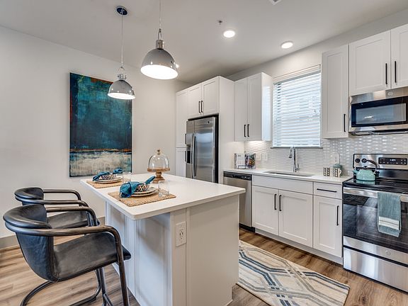 This stylish townhome features modern finishes, a two-car garage, and an open layout. Up the first set of stairs you'll find the kitchen, living area and half bath. The kitchen has stainless steel appliances, sleek white countertops, and an island perfect for meal prep or dining. Natural light pours through the large windows that open up to a balcony. Ascending to the third floor, you'll find a landing space perfect for a home office and the laundry closet. The oversized bedroom features a second balcony, a sitting area, an ensuite bath and walk in closet. This townhome offers easy access to shopping, dining, & entertainment. Amenities include an gorgeous infinity edge pool, gym with the latest equipment, grilling stations, fire pit, co-working space, lake with jogging path and two dog parks. 13-15 month leases available. Additional monthly fees include: package delivery fee of $15, trash fee of $25, pest control $1. One time administrative fee of $250 due at application.