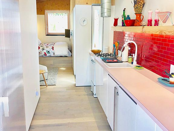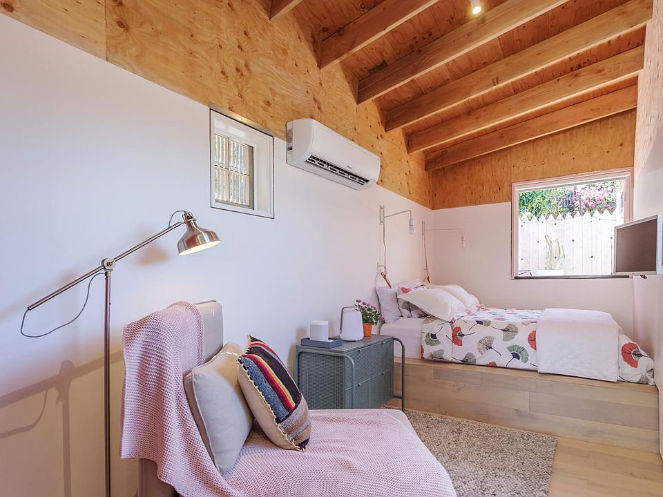 Super cool architectural gem tiny home with soaring skylight and cool outdoor spaces in the Silver Lake / Virgil Village neighborhood. Featured in Architectural Digest Clever. Walk down the street to Virgil and Courage Bagels and Squirl or up the street to Hoover to Cafecito Organico and other shops. Sunset Junction is walkable as well. This is a well appointed tiny house fully furnished with queen size bed (sleeping alcove) and chair that pulls out to a single bed. It is a freestanding home - with a sleeping alcove and front and back fenced in outdoor areas. The bedroom area is not seperated by a wall but it is quite unique from a studio due to the layout and overall size. Well insulated / completely fenced in with dedicated entry only for tenant of this house / washer / dryer in unit / also one refrigerator unit under counter AND one freezer unit under counter both by U-Line / / platform bed / living room area / kitchen with 16' long pink formica counter and work area / and washer /dryer; Furnished as pictured with small clothes dresser and outdoor furniture; can be leased unfurnished; designed by Keith Marks / Corie Saxman - HAM Architecture; nice views of the los feliz hills - Griffith Park and views to the west; Heath tile backsplash kitchen/ under counter refrigerator and freezer units / TV / microwave / work space at kitchen counter and outdoor outlet work bench / Street parking only; Tenant pays internet and power/ owner pays water; Samsung A/C / heat mini split Soaring skylight with lots of windows and natural light 4 ft square window opens off bed - roll out of bed to outdoor patio washer / dryer off site parking on non permitted street and surrounding streets close walk to Virgil / Hoover and Sunset Junction (10 min!) and super close 12-15 min uber/lyft to DTLA sq ft is approx tenant pays internet and power; owner pays water