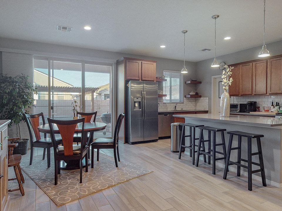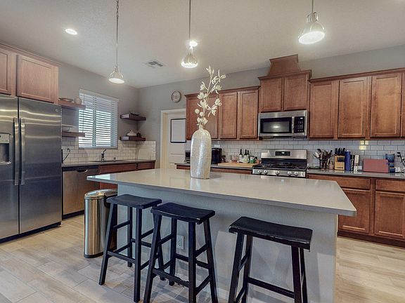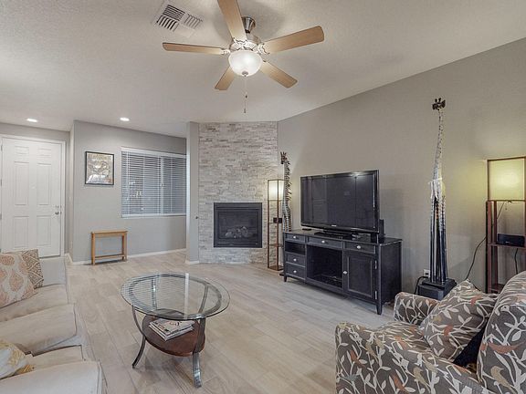 ALMOST BRAND NEW!!! This beautiful RayLee Home has three spacious bedrooms, an open kitchen which features 42'' kitchen cabinets, SileStone quartz countertops, walk-in pantry, tankless water heater, wired for an alarm system, all SS appliances convey, upgraded tile surrounds & flooring throughout. Seller has had gutters installed, custom window coverings, $10K in Landscaping and new technology garage remote. The backyard is ready for entertaining, with a custom pergola and picturesque views of the Sandia Mountains from the backyard. RUSH TO SEE THIS BEAUTIFUL HOME UNDER $300K!!!