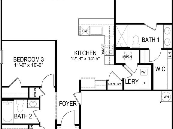 The primary suite is located at the back of the home and includes a walk-in closet and a private en-suite bathroom. Two additional bedrooms at the front of the home share a full bath, offering flexibility for family, guests, or a home office. A conveniently located laundry room near the kitchen adds to the home's smart and practical design.