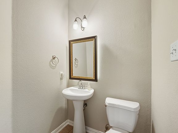Modern fixturesFresh neutral paintStainless-steel appliancesBrick-front beautyDark-stained hardwood stairsEngineered hardwood floorsDramatic two-story foyer