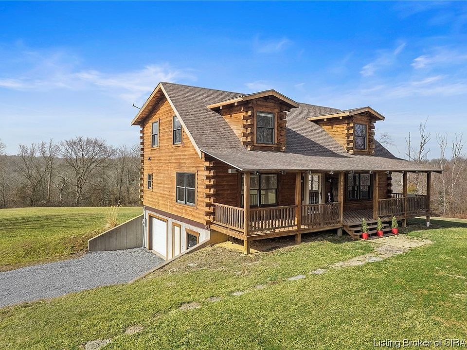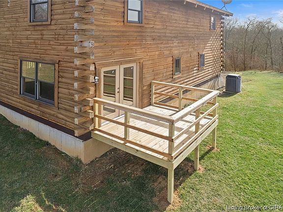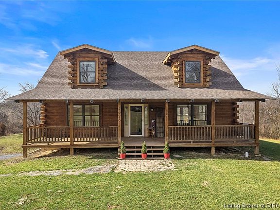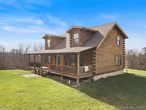 Just listed! 2 story log home over full basement situated on 5 acres m/l in popular Ryker's Ridge area of Jefferson County. Enjoy picturesque views of the beautiful yard and wooded valleys of Southern Indiana from every window. Recently updated, this home offers a great room with classic wood vaulted ceiling that includes the spacious kitchen with new induction stove in the island and new tile in kitchen and dining area. Master suite features a walk in closet, whirlpool tub, separate dual shower and new tile. The unfinished basement offers a garage and potential for a 4th bedroom/rec room or office. Enjoy the peaceful country setting and beautiful sunrises from the full length covered front porch. Located approximately 10 minutes from Downtown Madison Indiana.