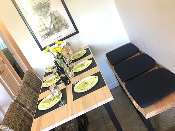 The primary bedroom includes a queen-size bed and flat screen TV. The den is furnished with a double murphy bed and live edge laptop desk.