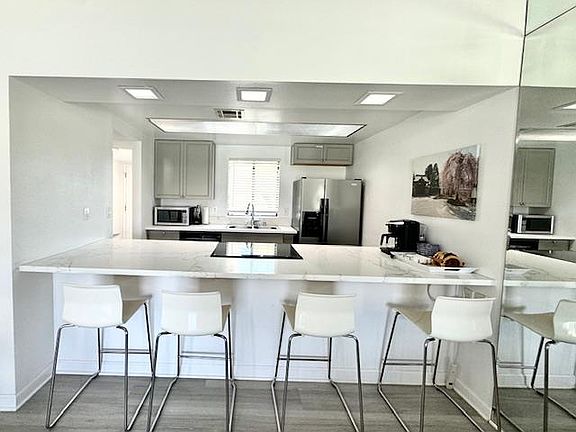 Welcome to your dream home in Palm Desert! This charming residence was recently upgraded. It offers 1,177 square feet of comfortable living space, featuring two bedrooms and two full bathrooms. The kitchen is a chef's delight with quartz and solid surface/Corian countertops, a skylight, and modern appliances including a microwave, oven range, and refrigerator. The open layout seamlessly connects the kitchen to the family room, creating a perfect space for entertaining.