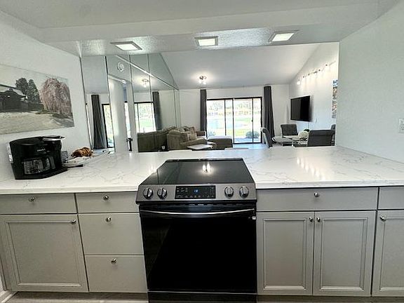Open layoutAwning in the backyardModern appliancesComfortable living spaceInside laundry areaHigh and vaulted ceilings