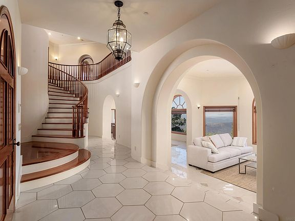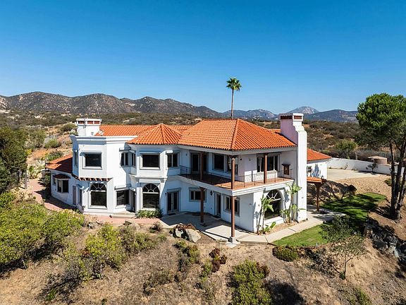 Welcome to 4029 Alta Loma, a striking Mediterranean-inspired residence perched atop a private hilltop in Jamul with sweeping views. Set on more than 5 acres with limited neighbors and the McGinty Mountain trailhead just behind, this custom estate offers an ideal blend of privacy, nature, and modern convenience, all less than 10 minutes from town. Spanning 4,650 square feet, the home features 6 bedrooms and 6.5 baths, thoughtfully designed for both everyday living and large-scale entertaining. Its sophisticated Mediterranean character is showcased with white-washed stucco exterior walls, interior arched doorways, and timeless details. Inside, the expansive great room with fireplace flows seamlessly into a formal dining area and chef’s kitchen with dual refrigerators and abundant storage. Natural stone flooring, a grand staircase with wood banister, wood-framed windows, recessed lighting, and custom finishes elevate the interior. The versatile floorplan includes multiple ensuite bedrooms, office/bonus spaces, and a media room with fireplace. The luxurious primary suite offers its own fireplace, outdoor patio, kitchenette, and spacious walk-in closet. Practical additions such as a powder bath, laundry chute, and LG Signature washer/dryer enhance daily living. Outdoors, two reservoir water tanks, septic system, dual propane tanks, and a private internet antenna provide practical support. A 3-car garage, newer furnace and water heater, and water-softening system add value, while electronic metal window coverings ensures peace of mind.