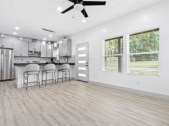 The kitchen is designed for both beauty and practicality, offering a walk-in pantry and flowing seamlessly into the living area, where luxury vinyl plank flooring carries through the kitchen, living room, and laundry room. Appliances include a side-by-side refrigerator, stove/oven and microwave. The open concept makes entertaining easy while keeping everyday living convenient. Outside, the white-and-black exterior gives this home striking curb appeal, ensuring it stands out as a unique stylish new build. Whether you’re looking for your first home, downsizing, or investing in a show-stopping property, this home checks all the boxes.