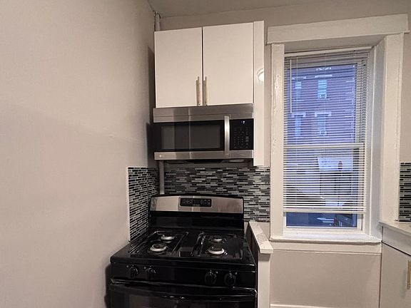 Contemporary tiled bathroomHigh-end finishesGorgeous hardwood floorsSleek white cabinetryLarge windowsNatural lightStainless steel appliances