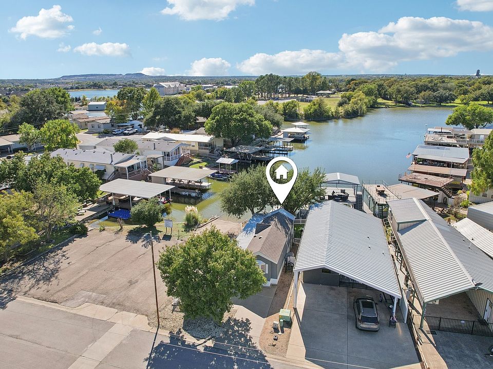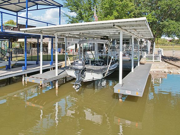 Lake Granbury Waterfront home located just off the Historic Granbury Square and the Granbury City Beach! Welcome home to Lake living! This cute and cozy Park Model home is located in the highly sought after community of Brazos Harbor! Covered boat dock with electric and cradle boat lift, plenty of deck space around the dock, sturdy stone sea wall, and located right next to the boat ramp! This is the absolute premier location in Brazos Harbor. Outside this home is a white vinyl fence surrounding the entire property, large mature shade trees front and back yard, artificial turf grass that requires no maintenance and stays green all year long! Fenced in back patio area overlooking Lake Granbury and your boat dock, private driveway, and a cute as a button storage building that matches the main home exterior. The ultimate showcase is the covered deck that runs the length of the home and wraps around the end of the home. Watch the boats and watch the sunsets over the Lake! Let's talk about the home! Park model 1 bedroom, 1 bath, 396 square feet built in 1995. Vinyl exterior siding and a brand new shingle roof! Inside there is beautiful wood look vinyl flooring throughout. No carpet! Granite countertops in the kitchen and bathroom. Full kitchen appliances. Electric stove, built in microwave, refrigerator, and washer dryer combo. Living room is very spacious and has full windows that look out to the Lake and your dock. Rustic and appealing ship lap siding accent wall in the living room. Functional kitchen with a breakfast area just off the kitchen that looks out to the boat ramp and Lake. Full bathroom with granite and shower. Master bedroom features ample cabinets and storage and an access door. Master bedroom also features very rustic and appealing accent wall with ship lap siding. This home is very clean and shows pride of ownership throughout. Home has City water and City sewer connections, space for a small boat trailer ,and a storage building. This is a must see home!