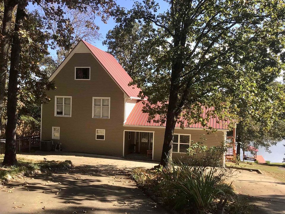 Detached garagePartially fenced in yardLakefront homeOverlooking screened in porch
