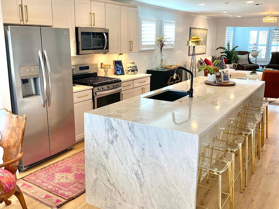 Stunning Upgraded Kitchen with Waterfall Edge Quartz Island, Hardwood Floors, Gas Stove, and New appliances.