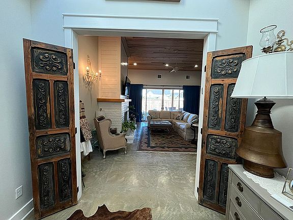 Upon entering, one is welcomed by an impressive Texas cathedral stained glass and striking natural wood high ceilings. Abundant natural light illuminates the interior through oversized glass doors that lead to a covered patio with a brick fireplace. Noteworthy features include accented walls, a built-in mudroom, and a generously sized kitchen island designed for ample guest seating. This home comprises three spacious bedrooms, two full bathrooms, and a large two-car garage with additional storage suitable for bikes, sports equipment, or outdoor gear, making it ideal for families or active couples.
