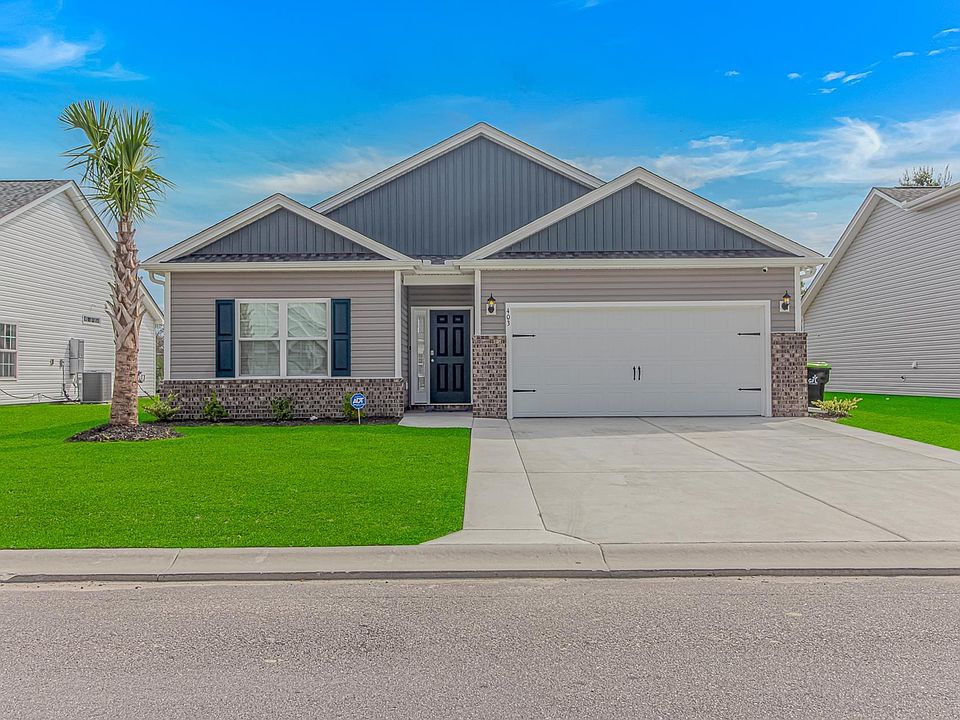 Charming New Construction Home in Ocean Palms – Coastal Living at Its Finest! Welcome to this stunning, new single-family home in the desirable Ocean Palms community, built in 2025 by Beverly Homes as part of the popular Topsail floor plan. Perfect for families, retirees, or anyone seeking a low-maintenance coastal retreat, this 1,543 sq ft residence offers an open, single-story layout with modern elegance and thoughtful design. Step inside to find 9-foot vaulted and tray ceilings that create a bright, airy atmosphere, complemented by designer cabinets and laminate wood flooring throughout the home. The gourmet kitchen boasts stainless steel appliances and quartz counters, ideal for entertaining or everyday meals. Enjoy energy-efficient features like natural gas heating, central air conditioning, and vinyl siding for durability and cost savings. The attached 2-car garage provides ample storage for beach gear, bikes, or golf carts. The driveway has an added 2 extra feet on both sides for wider parking spots. Outside, the home sits on a spacious 6,534 sq ft lot. With low HOA dues, you'll have more time to relax and enjoy the lifestyle. Location is everything here – just a quick golf cart ride to Surfside Beach, "The Family Beach," where you can soak up the sun, fish from the pier, or stroll the parks. Proximity to shopping, restaurants, top-rated medical facilities, hospitals, and Myrtle Beach attractions like golf courses, entertainment venues, and the airport make this spot incredibly convenient. Families will appreciate the award-winning school district. This turnkey property represents exceptional value in a thriving coastal market. Don't miss your chance to own a piece of paradise – schedule a showing today!