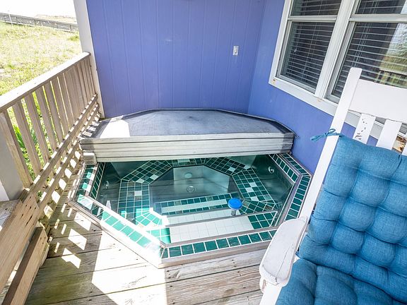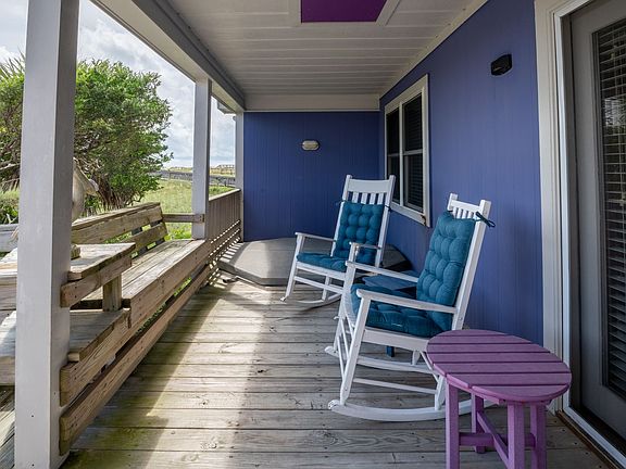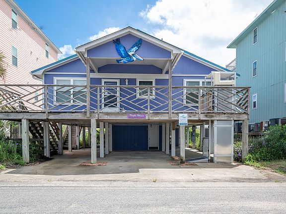 Purple Pelican-4 Bedroom / 2 Bath / Sleeps 8 Bring your furry friends because Dogs are Allowed at the Purple Pelican, an Oceanfront single-family home much beloved by long-time residents of Carolina Beach. You will be nestled in a one-way street close to the Carolina Beach Farmer's Market, Carolina Lake, and Veggie Wagon. Enjoy raucous family time or quiet privacy undisturbed on your covered porch with a private sunken hot tub, and private boardwalk to the beach. This quintessential floorplan features a great room with four corner bedrooms and two jack n' jill bathrooms. Your stay can be simple, homey, cozy, and directly focused on the beach. Feel free to bring Grandparents, or recuperate from surgery here at the ocean: our front porch has a lift elevator! Purple Pelican is one of the last few remaining private beach cottages on the oceanfront at Carolina Beach, just waiting to make you part of the family! Covered parking for 4-5 vehicles under the house and on the parking pad. Kitchen: Fully equipped, dining room. Living Room: New sectional sofa, side chairs, occasional tables, games and books, Smart TV with DVD player, entrance door to porch Two bedrooms share Jack-Jill bathrooms on EACH side of the living room: Covered Porch: Rocking Chairs with Cushions, Drink Table, Outdoor Dining table Seating Six, Bench Seating surrounding porch, Sunken Hot Tub, Outdoor Shower, Boardwalk to Beach, More bench seating out at the dunes.