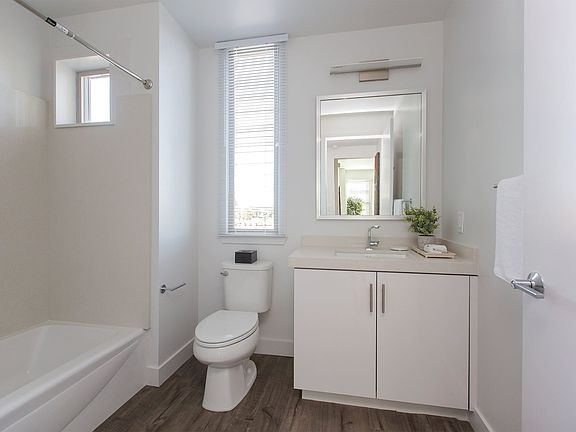 This large three bedroom is well lit and has beautiful modern dark gray wood-patterned luxury vinyl tile (LVT) floors; high ceilings; quadruple-pane windows; forced air conditioning and heating; a large patio; and a full-size washer and gas dryer in the unit. The modern open kitchen has a Caesarstone quartz countertop and backsplash and stainless steel GE appliances including a gas range. The large bathroom has high-end finishes and a tub. The apartment is uber-efficient with a Navien tankless gas hot water heater, LED lighting, and spray foam insulation for superior sound insulation and temperature regulation. Parking for 1 car completes the home.