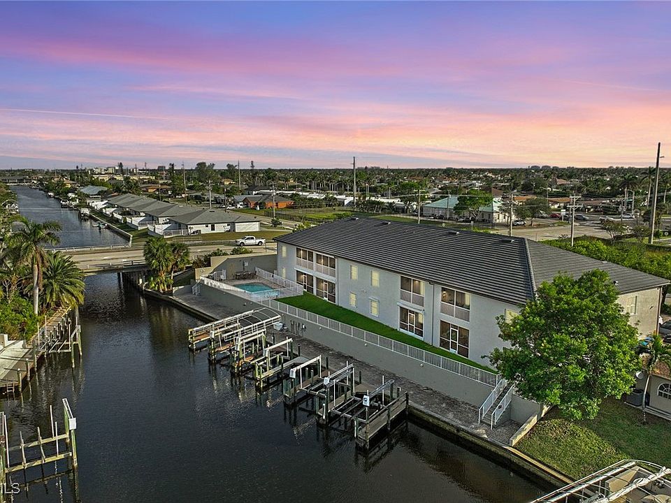 PRICE IMPROVEMENT! BOAT SLIP & FURNITURE INCLUDED! SMALL FINANCIALLY SOUND COMMUNITY! Nestled in a rarely available, small, pet friendly, Gulf-access community, this stunning property offers the perfect blend of luxury, convenience, and serene waterfront living in SW Cape Coral. The freshly painted exterior and BRAND NEW tile roof set the stage for this meticulously maintained community. Step inside and discover a thoughtfully designed layout with HIGH vaulted ceilings, crown molding throughout, and tile flooring in the main living areas, while cozy carpet adds comfort to the bedrooms. The modern kitchen features granite countertops, a breakfast bar, maple cabinets, recessed lighting, and a large walk-in pantry that doubles as a laundry room with extra storage. The spacious living room is perfect for entertaining, while the den with frosted glass doors adds a stylish and functional flex space. Decorative niches throughout the home add unique character and charm. Relax on your screened, tiled balcony overlooking the heated pool and canal, complete with impact sliding doors AND electric shutters for added security and peace of mind. Outdoor enthusiasts will love the boat slip, dock, and captain’s walk, providing boating access to the Gulf of Mexico. The main suite is a spacious private oasis with views of the water, a large walk-in closet with attic access, and a luxurious en-suite bathroom featuring a floor-to-ceiling tiled shower with decorative listello, dual sinks, and a linen closet. Watch manatees and dolphins year-round right outside your back door, making this home a true coastal paradise. You deserve everything that SWFL has to offer: temperate weather year round, boating, kayaking, jet skiing, world class fishing and white sandy beaches at your fingertips!