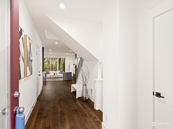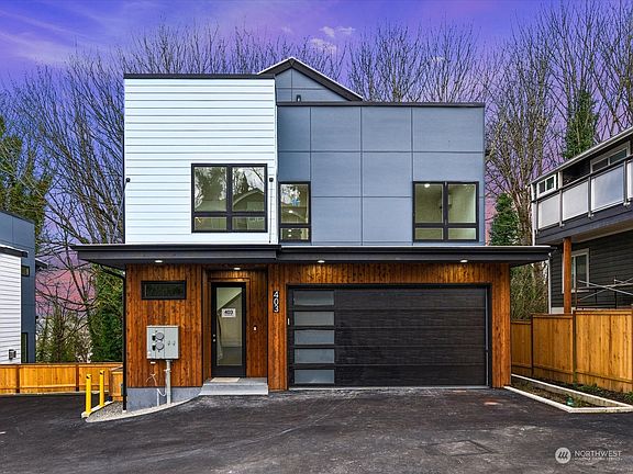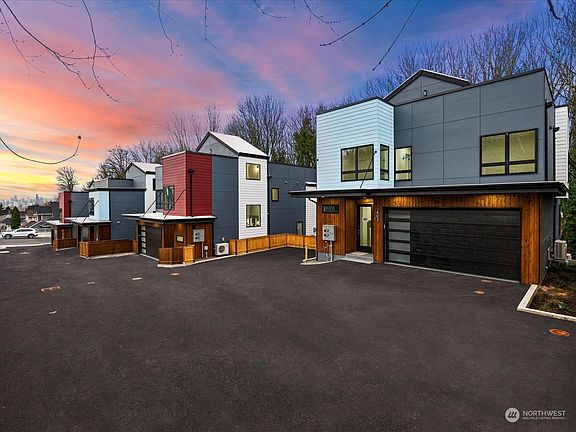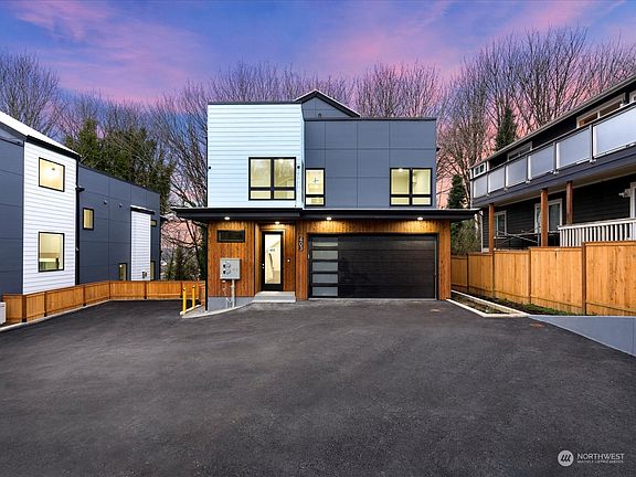 Luxury, new construction at Thistle Greenbelt Community in Highland Park. These contemporary homes embody Seattle's best. A serene oasis nestled in a cul-de-sac beside a tranquil, tree-lined greenbelt. The stunning main floor boasts modern finishes, custom cabinetry, stainless steel appliances, sleek waterfall island, and gas fireplace. Abundant windows bathe the space in natural light. HE Mini-Splits offer AC and heating. Upstairs, 3 bright bedrooms plus primary suite with a lavish 5-piece master bath. The rooftop presents expansive city views. An approved ADU with separate entry and electric meter adds potential for rental income. Finished garage is wired for electric car charger. Conveniently located near downtown, airport, and shopping.