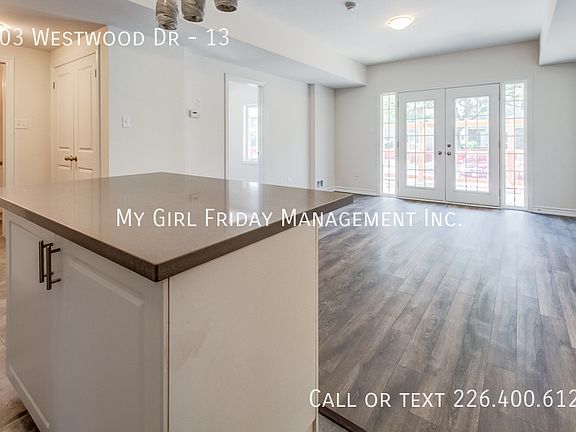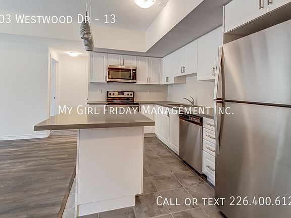 This Luxury condo will not last long. 403 Westwood Drive in Kitchener is a stunning 2 bedroom, and 2 full bathroom (one bathroom has a tub shower combo and the other has a walk in shower). Two parking spaces are included in the rent. The gourmet kitchen offers ample counter and cupboard space and features a large island breakfast bar, double sinks, stainless steel appliances including a range fan microwave and dishwasher. The front entry boasts lots of room as well as a good-sized front hall closet. Note that there is a staircase leading to the apartment so one must be comfortable on a full staircase. The living room is large and bright and there are 2 French Doors leading out to a private patio. There is ensuite laundry. Each bedroom is large and bright. The master offers 2 large closets as well as an ensuite bathroom. There is a furnace room, cold cellar, and large alternate storage unit. Utilities are additional, and the tenant can expect to pay hydro, water, and gas. The furnace is a brand new forced air gas furnace and even has an air exchange system built in! There is central air conditioning. This unit is available for a move-in date of Sept 1st or Sept 15th. We will start showings right away, so kindly reply to this ad to arrange a time to come and see this lovely space.