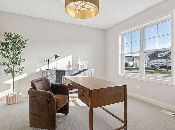 Our Halstead plan offers executive style main floor living in a conveniently located neighborhood. Home has Anderson windows, James Hardie siding on all sides, dual zone heating, professional landscaping, sod, irrigation, and trees. Great room features 11' vaulted ceiling, stone fireplace with floating shelves, sunroom with maintenance free deck just off dining area, gourmet kitchen with wall ovens and 36" gas cooktop has a generous walk in pantry and lare center island with storage on both sides. 9' lower level walkout has a private yard feel with paver patio to enjoy those beautiful days of fall. Walk up wet bar, fireplace, family room, game room, two nicely sized bedrooms and a full bath make this a fun level for guests, entertaining, or just enjoying your own home. Move in ready.