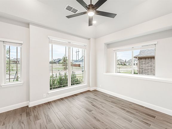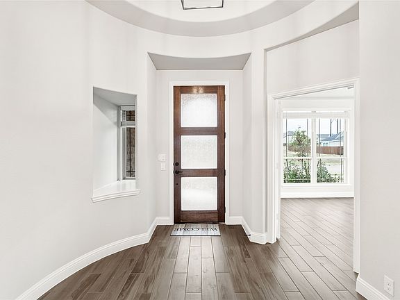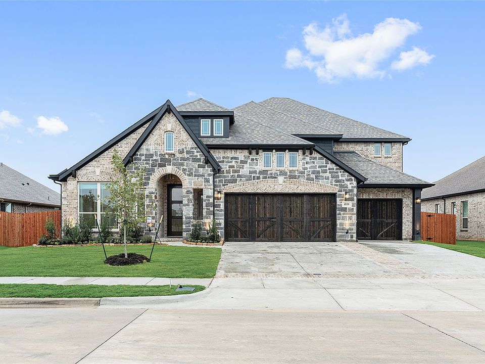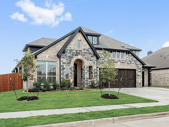 BRAND NEW & NEVER LIVED IN – An inventory home currently under construction, ready for you to move in! Discover elevated design and intentional living in the Primrose FE VI by Bloomfield Home, a spacious and well-appointed 5 bedroom, 4.5 bathroom two-story layout with room for everything and everyone. This home makes a bold impression with its brick and stone elevation, brick front porch, and a grand 8' front door that opens into a dramatic rotunda-style entryway, setting the stage for what's inside. Step into the private Study with glass French doors, then flow into a bright, open-concept living area with vaulted ceilings, stained beams, and expansive windows that fill the space with natural light. The Family Room is anchored by a floor-to-ceiling stone fireplace with a cedar mantel, offering a warm focal point and modern flair. The Deluxe Kitchen is both stylish and functional, featuring double ovens, a 5-burner cooktop, pull-out trash bin, glass pantry door, and custom cabinetry including pot and pan drawers. Finishes like solid surface countertops, under-cabinet lighting, and a custom vent hood elevate the space. A mud room and large utility room with built-in sink add convenience behind the scenes. The downstairs layout includes a spacious Primary Suite with window seat, generous ensuite bath with dual vanities, garden tub, separate shower, and walk-in closet. Two additional bedrooms share a full bath on the main level. Upstairs, you'll find a Game Room, Media Room, and two more secondary bedrooms—each with its own private bath. Throughout the home, thoughtful upgrades include 2-inch faux wood blinds, gutters, ceramic tile shower walls, and extended concrete patio, ideal for outdoor entertaining.