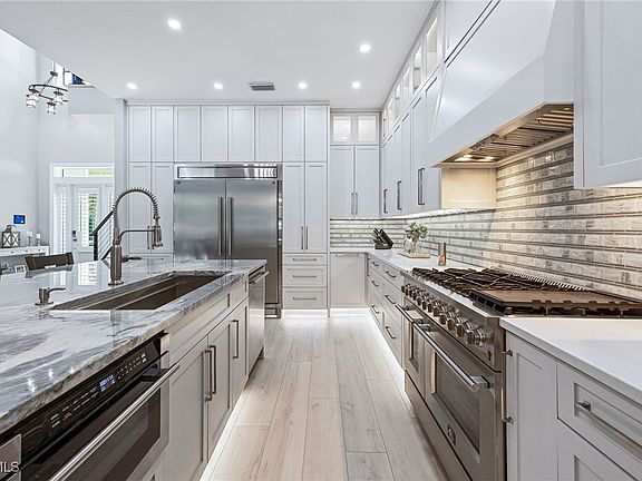 Inside, soaring high ceilings enhance the open-concept layout featuring gorgeous LVP flooring throughout, a custom fireplace, a remodeled chef’s kitchen with a large island, built-in pebble ice maker, handmade custom cabinetry, Taj Mahal countertops in bathrooms, upgraded Delta faucets, and top-of-the-line commercial-grade stainless steel appliances, including a propane range and double oven. The first-floor primary suite is a dream retreat with custom his and hers closets, plantation shutters, and a completely remodeled spa-like bathroom boasting dual sinks, an oversized walk-in shower, a soaker tub, and generous countertop and storage space. Two additional guest bedrooms downstairs each feature their own private baths, along with a dedicated office/den off the living room. Upstairs, the spacious loft features double doors that lead out to a private deck overlooking the resort-style backyard oasis, shaded by majestic oak trees, plus there’s one more additional bedroom and bathroom.