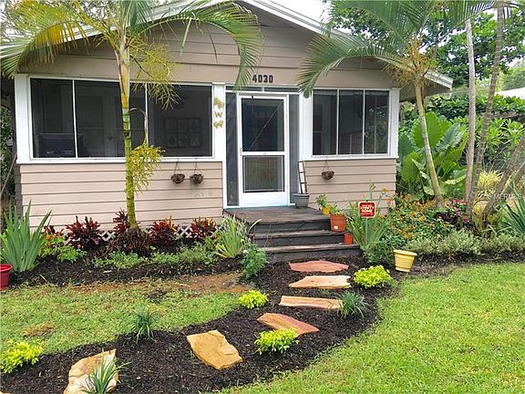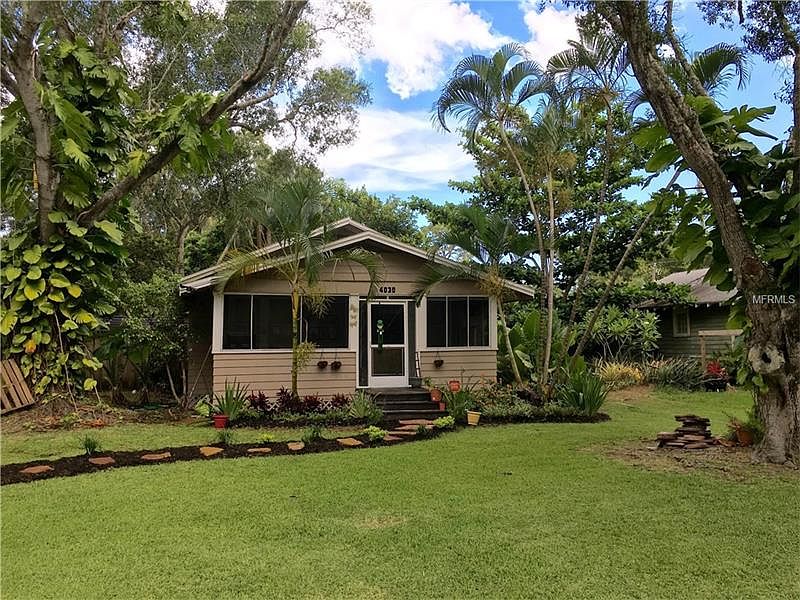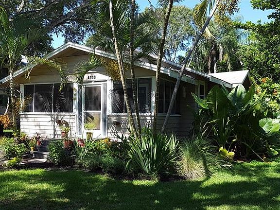 Curb appeal alert ! This cozy 1925 2 bedroom, 2 bath cottage nestled in a tropical landscape has it to spare. From the curved front walkway, bordered on each side with plants, to the treed fenced backyard, with shed, your surrounded by nature. The spacious screened entry porch leads into the house to the dining room, through the archway to the living room, kitchen & screened back porch. Wood floors, built-ins, A/C 2013, roof Oct 2012, hot water heater 2008, hooked up to sewer in Dec. 2013, new granite driveway. The central location gives easy access to shops, restaurants, I-75, downtown Sarasota & world famous Siesta Key Beaches.
