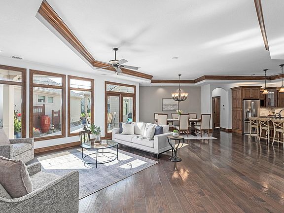 Welcome home to 4030 N Goldenrod Ct, a luxury no-step patio home where premium craftsmanship meets low-maintenance living. A BRAND NEW CLASS IV Tamko roof will be installed prior to closing, giving buyers peace of mind for years to come. From the arched doorways and hickory engineered hardwood floors to the solid knotty alder doors and trim, every inch of this home reflects top-tier quality. The open great room features a stacked-stone gas fireplace, crown molding, and abundant natural light. The chef’s kitchen is a showstopper with granite countertops, a large island, stainless GE Profile appliances including a double oven, walk-in pantry, display cabinetry, and both over and under-cabinet lighting. The serene primary suite feels like a private retreat with a custom electric fireplace, crown molding with backlighting, massive walk-in closet with built-in ironing board, private patio access, and a spa-inspired bath offering heated tile floors, dual vanities, center storage, and a luxurious walk-in tiled shower. A second bedroom with extra-tall windows is adjacent to a beautifully finished hall bath with travertine floors and high-end fixtures. The versatile flex room with heated tile floors and two walls of windows makes an ideal office, hobby space, or sunroom. The laundry room is designed for function and storage, while the oversized two-car garage impresses with a commercial-grade epoxy floor, 18-foot door, attic storage, smart WiFi opener, and built-in car vacuum. Additional upgrades include a 2023 tankless water heater, high-efficiency hybrid heat pump HVAC, water softener, reverse osmosis system, Nest thermostat, Ring doorbell, Nuvo sound system with six zones (four active) and 12 ceiling speakers, Windsor wood-clad windows and patio doors, central vac, and newer interior paint (2023). Outdoors, enjoy a beautifully landscaped private courtyard with fountains and lighting, plus an extended partially covered back patio that offers peaceful water views and a front-row seat to neighborhood fireworks. A storm shelter provides added safety. HOA dues cover exterior maintenance, lawn care, snow removal, trash service, and access to the neighborhood clubhouse and pool, allowing you to fully enjoy the "lock and leave" lifestyle. With excellent neighbors, a strong sense of community, and proximity to shopping, dining, and highways, this home offers comfort, security, and style in one perfect package. They don’t come along in this condition often, so schedule your showing today and see why this one stands out from the rest. *See the promo video for an inside look at this exceptional home.*