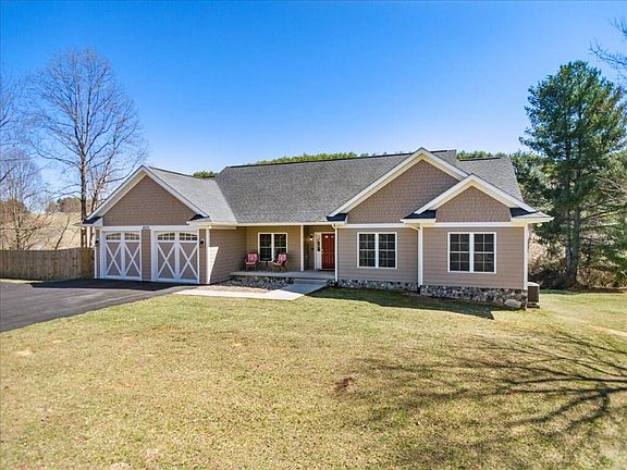 Sweeping views, space & beauty define this custom-built ranch w/delightful craftsman touches! Every detail carefully considered for finest in modern living in desirable open floor plan! Soaring high ceilings, gleaming hardwd flrs, stylish fixtures/lighting & large, unfinished basement has framing in place for easy finishing! Huge living rm with vaulted ceiling, recessed lighting & large windows for gatherings of any size & quiet moments alike. Kitchen island w/bar seating, SS appliances & abundance of cabinetry. Lrg composite deck for al fresco dining! Primary w/tray ceiling, WI closet, dual sink vanity & tiled shower. Basement family rm with LVP, fireplace & pre-fab insulated concrete walls making it energy efficient! Peaks Knob Mountain views. 4 lots total border New River Trail
