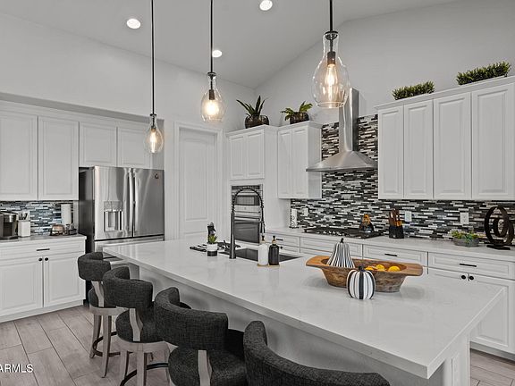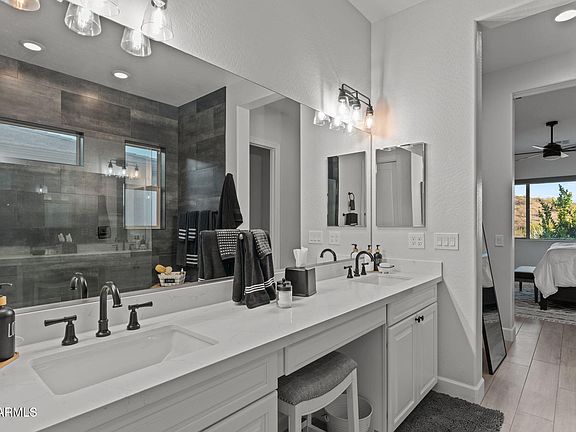 At the end of a spacious cul-de-sac in Wickenburg Ranch, this property offers the kind of setting that feels both rare and personal. With no homes behind it, the backyard opens to the east, framing each morning with sweeping views of hills and mountains as the sun rises over the desert. It's privacy and beauty combined, a backdrop that feels like it belongs only to you. Inside, two distinct bedroom retreats anchor the home: the primary suite with its en suite bath, and a separate suite complete with its own sitting room and bath — ideal for guests or extended stays. Tile floors and quartz countertops throughout keep the home grounded in timeless style, while a fireplace adds warmth and character to the main living area. Out back, the rises to another level with a... built-in BBQ, fire pit and a hot tub set against the open desert sky. It's a space that adapts effortlessly serene mornings with coffee, restorative afternoons in the water, or evenings that linger with friends around the fire. Each detail is designed to draw you outside, where the views and the sense of openness become part of daily life.
