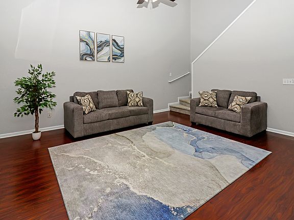Spacious primary suiteWood floorsWalk-in closetFresh gray wallsCustom soft-close cabinetrySoaring two-story great room