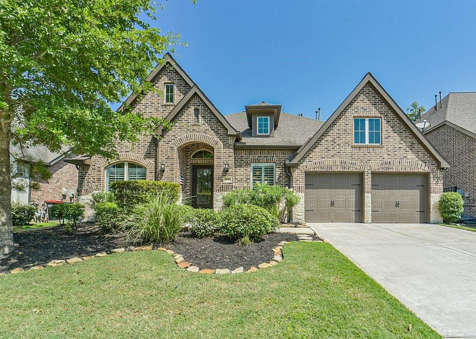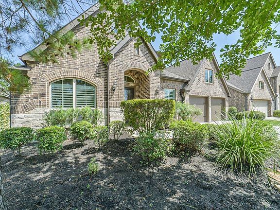 This one-story Perry Homes residence offers approximately 3,457 sq ft of living space on an 8,272 sq ft lot. Layout includes four bedrooms, three full baths, and one half bath. Entry features 12-foot ceilings and leads to a formal dining room and study with French doors. Open-concept kitchen includes a large island, stainless steel appliances, and walk-in pantry, connecting to a spacious family room with a wall of windows and gas fireplace. Primary suite offers dual vanities, soaking tub, separate shower, and two walk-in closets. Additional bedrooms each include walk-in closets, with a game room providing flexible space. Exterior features brick façade, covered patio, fenced backyard, and attached three-car garage. Located in Conroe ISD with access to community pool, parks, and walking trails.