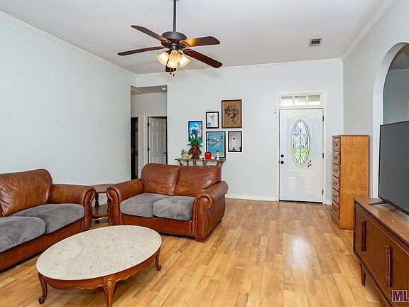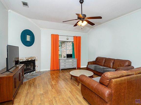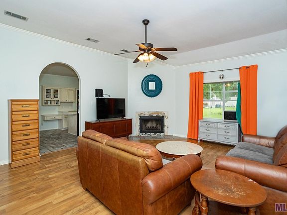 Located just 1 mile from the brand-new Prairieville High School, this home offers functionality and comfort. Inside, you'll find crown molding and a kitchen with abundant cabinets, storage, black appliances, an island, and a convenient desk. The spacious master bedroom features a tray ceiling, an en suite bathroom with dual vanities, a large soaking tub, skylights, and an exceptionally large wrap-around closet. Ceramic tile covers all wet areas, while the living room boasts beautiful wood floors, a 10-foot ceiling, and a cozy wood-burning fireplace. Outside, the large backyard, with mature trees and a detached shed, provides ample space for outdoor activities. This home is a perfect blend of practicality and prime location.