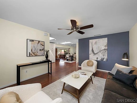 Nicely updated 3-bedroom, 2-full bath home with large back-facing family room in North Clairemont awaits. Tasteful touches include wide-plank and tile flooring, recessed lighting, accent walls, ceiling fans, tons of cabinet space, built-in shelving, and a real brick fireplace. The backyard has a covered concrete patio with a terraced back perimeter ideal for gardening, and with ample space for a pool and hot tub. The backyard casita is equipped with AC and electric so perfect for an at-home office, kids' play space, or hobby hut. The garage has a built-in room with AC unit. Solar to be paid at close.