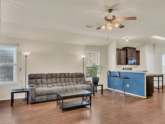 This home offers a functional open floor plan with a private primary suite featuring a walk-in closet and ensuite bath with dual vanities, soaking tub, and separate shower. The kitchen with breakfast bar flows into a spacious living area with large windows, and ceiling fan. Step outside to a fenced backyard with patio, perfect for relaxing or entertaining. The yard boasts sprinkler system and privacy fence. Wind down in the back yard after a long day or take a walk to the nearby park. Must see!