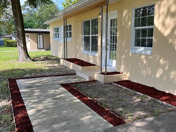 This renovated 4 BR, 2 BA concrete block home is located in a sought-after well-established neighborhood. A fresh coat of interior and exterior paint, along with new attic insulation, the home features new fixtures in bathrooms and kitchen. Other extras includes a new roof in 2022, newer windows and duct work. The bonus room, has its own private entrance and en-suite kitchenette - ideal for a home office or in-law suite. Parking is a spacious covered carport with a large laundry room behind double doors including EZ access to dyer vent cleaning. The fully fenced backyard is perfect for outdoor entertaining. The property is conveniently located near shopping, dining, plus NAS Jax, and Florida State College - Kent Campus. Easy access to I-10, I-295, and I-95 makes commuting a breeze.