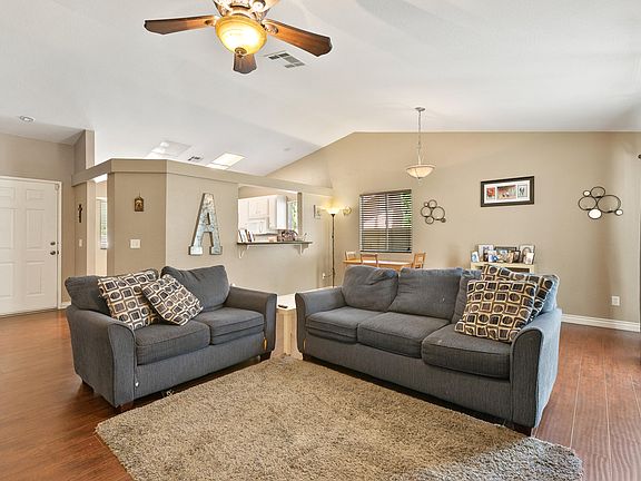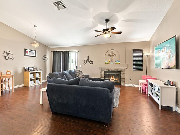 Adorable house in Rancho Vista. Granite countertops, hardwood, carpet and tile flooring. Kitchen has breakfast nook and breakfast bar, living room with woodturning fireplace. Indoor laundry room, ceiling fans. Private backyard features block walls, covered patio. Front and back landscaping, plus three car garage. Near golf course, Esperanza Elementary and Hillview Middle School.