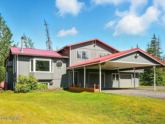 This beautifully updated home blends comfort and space for effortless gatherings with endless amenities and expansive picture windows that fill the main living areas with natural light and frame breathtaking views of the Butte. Enjoy the fresh, falling snow this winter without getting your feet wet! No more trudging through snow - your oversized carport keeps the entry and your feet dry.This home was designed with entertaining in mind. A 14'x22' enclosed porch with outdoor kitchen expands your living space (corrugated panels can be removed for bringing the outdoors in, without the bugs), while the hot tub room with vaulted tongue-and-groove ceiling opens to the upper deck, complete with a pergola and sweeping views of the Chugach Mountains. The lower level adds even more space with a family room and wet bar, perfect for gatherings. The primary suite offers double closets and a full bath. Recent updates include a new boiler, HVAC, carpet, and luxury vinyl plank flooring (2023). An oversized garage provides a utility sink, laundry, and plenty of room for one or two workbenches. Enjoy quiet living just 15 minutes from amenities, with an easy Anchorage commute and breathtaking views along the way.