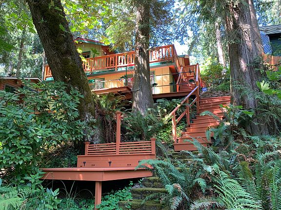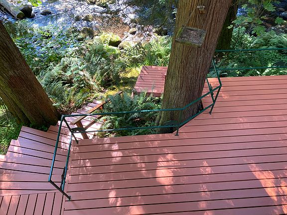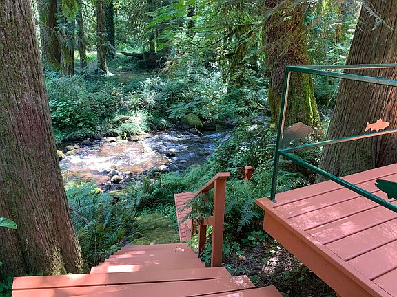 Yearly lease: ESCAPE THE CITY TO 3 LEVELS OF WRAP AROUND DECKS overlooking a year round waterfront creek, 1 bedroom and bathroom upstairs on the main level. 1 bedroom with a large master suite (including a large jacuzzi tub) downstairs, with a flat screen TV, propane fireplace, screened french doors , and a deck overlooking the creek. Also downstairs is a small office. A loft with a large skylight is over the living room. Not pictured is an outdoor 8 x 10 office space that can be used as extra storage. 1300 sq ft of cozy RETRO CABIN FEVER. LIKE NEW UPSCALE appliances. A Jennair range, a BIG CHILL RETRO dishwasher with a matching LARGE RED BIG CHILL REFRIGERATOR. New LG Washer and Dryer. Chrome towel warmers in both bathrooms. Lots of insulated windows that all open to the outside fresh country clean air. You can smell the cedar trees that surround this custom home and be on vacation 365 days a year. The propane fireplace in the living room has an upscale insert that can also heat the whole house in the winter if needed Lots of extra lights everywhere with over 10 skylights scattered throughout the house in almost every room. Vaulted ceilings in the main living areas and designer ceiling fans upstairs and downstairs. Tile floors upstairs and commercial like new carpet in the master bedroom with a walk in closet and washer and dryer.An RED powder coated outdoor bar with matching barstools overlooks the creek. A large patio/deck with a hook up for a gas barbeque. A double car carport outside with plenty of off street parking. ALL OF THE OUTDOOR MAINTANENCE is included in the lease as well as sewer, water, and trash. ESCAPE THE CRAZINESS OF THE CITY and LIVE LIFE OUT IN THE WOODS and on a WATERFRONT creek where you can still be close to Portland (45 min) close to Gresham (20 min) and only 30 minutes to Mount Hood for winter snow and 1 1/2 hours to the ocean. You must have a credit score of at least 650, proof of employment, with a total household income of at least $7-8k a month. Available September 1st or immediately. A refundable security deposit of $5k is required with a year to year lease minus a $250 cleaning fee. Small pets are okay. The front yard is fenced. No large dogs. No smokers, vaping, or drugs. Maximum of 3 people full time. Call or text for an appointment to view this property. Year to year lease. Refundable security deposit of $5000 less a $250 cleaning fee if upon vacating the property it is left in the same good condition. No smoking or vaping. Small pets allowed. Fisheman's paradise. You can walk to the best fishing spot where the Cedar Creek meets the Sandy River. Cedar Creek is a year round protected Salmon habitat. Heat is propane and/or electric. Attached carport parking for 2 plus guest parking. On a quiet dead end road.