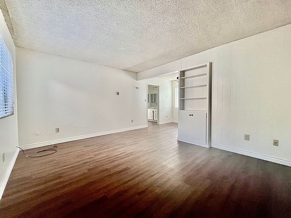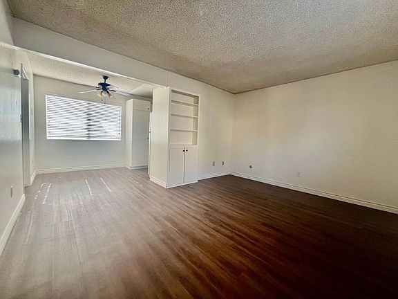 This apartment home offers a spacious living room with a built-in bookshelf.
