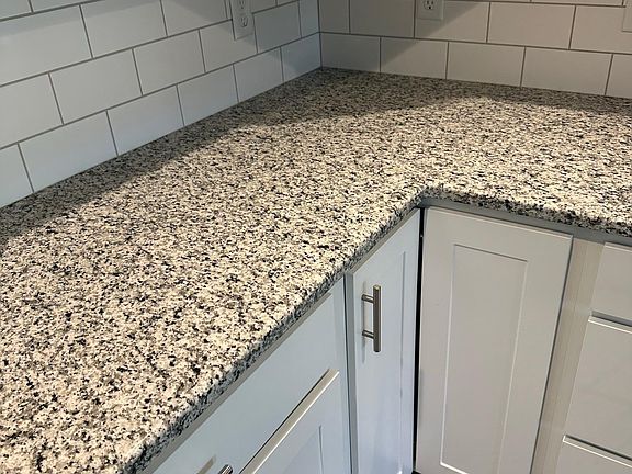 Stainless steel appliancesWhite cabinetsTile backsplashGranite counters