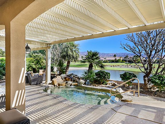 Welcome to this stunning and desirable La Paz floor plan home located in the Sun City Shadow Hills community. Enjoy expansive views of the 5th tee of the golf course overlooking the picturesque lake through a stunning desert landscape with privacy palms. The tranquil backyard offers a rock waterfall into the private spool which features a hot water circulator. An ideal setting for both quiet evenings and lively outdoor entertaining, for those who love to entertain, discover a built-in granite BBQ, perfect for grilling and gathering, complemented by a covered Alumawood patio that spans the length of the house. A detached Casita with separate entrance provides private guest access. In total, this model boasts 3 spacious bedrooms plus a den and 3.5 bathrooms. This thoughtfully designed home boasts a seamless flow between living areas and has been meticulously maintained to ensure comfort and style.You're greeted by beautiful tile flooring throughout all common areas, offering both elegance and easy maintenance. Privacy shutters and ceiling fans ensure year-round comfort and privacy and the bedrooms are carpeted for an added warmth. The expansive owner's suite is a true retreat, featuring dual vanities, a separate tub, and a full shower. The large walk-in closet, complete with built-in organizers, provides ample storage space. The kitchen showcases a spacious island perfect for food prep and entertaining. Stainless steel appliances complement the kitchen's style, while the decorative backsplash adds a touch of sophistication. A cozy kitchen nook also offers a casual dining space. The expansive 3-car garage provides ample storage, with additional cabinets and overhead storage racks as well as a 240 volt outlet for charging an electric vehicle or connecting appliances. The home also includes a dedicated laundry room and beautiful walkway along the side yard for ease of access to the backyard.Living in Sun City Shadow Hills means access to a wealth of exceptional community amenities, including two championship golf courses, a state-of-the-art fitness center, tennis courts, a full-service clubhouse, and a variety of recreational activities tailored to an active adult lifestyle. With the added benefit of 24-hour security, you can truly relax and enjoy everything this beautiful community has to offer.