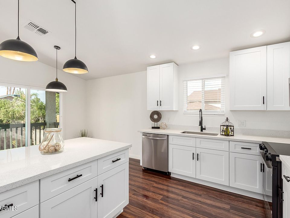 Walk into your ''hard to find'' true 5 bedroom-2 bathroom home in quiet Mesa neighborhood. Tri-level home w/ recessed lighting, a contemporary palette w/ wood & travertine flooring & custom feature wall w/ electric fireplace. Upgraded kitchen w/with new quartz countertops, new white shaker cabinets, stainless steel appliances, a pantry &peninsula w/ breakfast bar. 2 large bedrooms upstair w/ primary bedroom suite downstairs offering a custom walk in closet and ensuite bathroom. 2 generously sized additional bedrooms downstairs. Step outside to your deck and enjoy cotton candy Arizona sunsets or dine outside under your large ramada. Home offers a 2 car garage and RV gate for all your toys or storage. Close to freeways, Dana Park shopping center, schools and more.