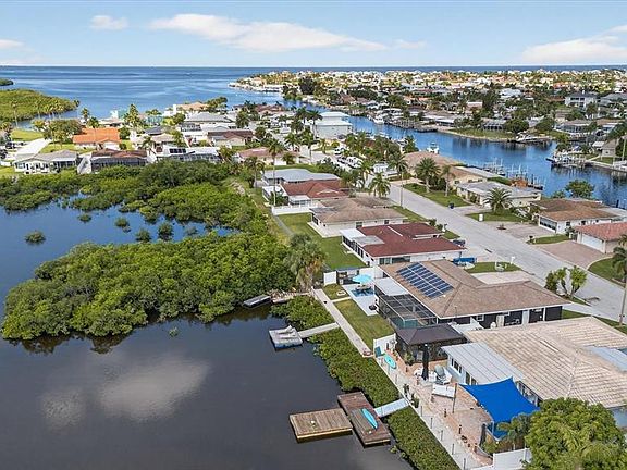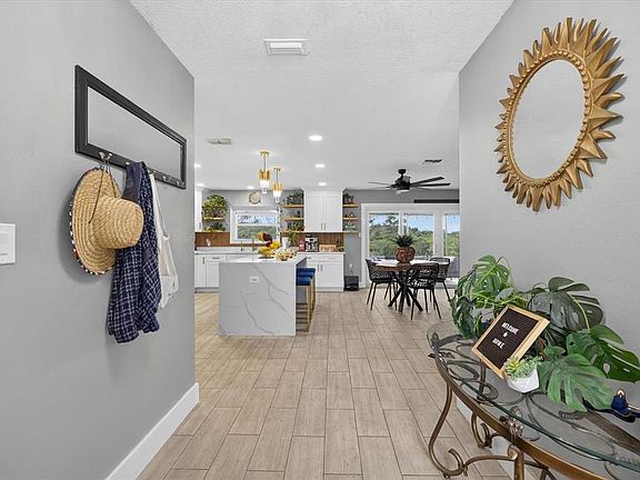 They say the best is yet to come—or maybe you’ve already found it here at 4038 Rudder Way in Gulf Harbors’ treasured waterfront community. This 3-bedroom, 2-bath, 2-car garage home is a PRIVATE, and sacred coastal retreat that has been reimagined with a modern, contemporary design and luxury finishes throughout. Step inside to a wide-open floor plan dressed in plank tile flooring and filled with natural light. The kitchen is a true show stopper—outfitted with soft-close solid wood shaker cabinetry, brass accents, LG WiFi stainless appliances, a gas cooktop with center griddle, air fryer oven, stone backsplash that reaches the ceiling, and a stunning waterfall island complete with a trendy microwave drawer. Dual pantries surround the refrigerator, and just off the kitchen you’ll find a cabinet hidden mudroom and indoor laundry space with floating shelves, a utility sink, and even a dog shower—a thoughtful touch for modern easy living. The primary suite offers both a walk-in and secondary closet, along with water and pool views and a sleek ensuite featuring a his-and-hers floating vanity, a walk-in shower, and private water closet. The real showstopper is tucked behind a hidden door: a Hard Rock Hotel-inspired spa-like bathroom complete with a walk-in steam shower with wall jets, dual shower heads, mosaic ceiling tile, soaking tub, double vanities, and floating toilet in the private water closet. Lots of updates have been done to the home including all updated windows and slider that are hurricane rated, with low home insurance with practically every discount available, and the sellers will install a new roof at closing. Flood insurance is available and assumable being extremely low at around $3,000 a year. Outside, the backyard delivers the “wow” factor with uninterrupted views of the protected Eagles Nest Park, where bald eagles, spoonbills, herons, dolphins, and manatees are regular visitors. The concrete pool with waterfall feature, covered screened lanai, new outdoor contemporary roofed kitchen with gas grill and refrigerator, and the side dog run make it easy to enjoy Florida living at its best. A floating dock with Gulf access offers adventure at high tide and a sandbar to explore at low tide all with easy access at your backdoor. This is the perfect place for adventurist who love paddleboarding, kayaking, and jet skiing or light boating. The community has an optional HOA of only $125/year, and for just $200/year, you can enjoy the private Gulf Harbors Beach Club with its gated beach, cabanas, grills, restrooms, and shaded seating. All of this just a golf cart ride away from the expanding downtown New Port Richey with restaurants, shops, and live entertainment. This home is more than move-in ready—it’s a private paradise waiting for its next chapter. Will it be yours?