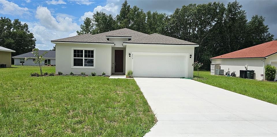 NEW CONSTRUCTION - MUST SEE! Recently completed and move-in ready! This 4-bedroom 3-bathroom 2-car garage home is nestled in a prime location of Marion Oaks on a quiet street with great neighbors. This home has 1,990 sq ft of living space (2,500 sq ft under roof) with access to county water. Conveniently located near major highways, and close to Marion Oaks Elementary School, nature and bike trails, and campgrounds! You'll love this modern, bright, open-concept floor plan with high ceilings, double pane windows, tray ceilings, and a covered lanai. The gourmet-inspired kitchen features cabinets with a large center island, stunning quartz countertops, tiled backsplash, a spacious pantry and Samsung stainless-steel appliances. Durable water/scratch resistant Revwood flooring throughout the common areas, lush carpet in the bedrooms and designer tile in every bathroom with upgraded quartz countertops. A spacious master bedroom featuring tray ceilings, dual walk-in closets, dual vanities, and a large walk-in shower with a glass enclosure. The front bedroom with an attached full bathroom is perfect for a guest room, in-law suite, or office. Two additional bedrooms share the third full bathroom. Samsung washer and dryer are included. Additional upgrades include a smart home technology package including a ring doorbell, smart switches, and a digital programmable thermostat. 10-year Maverick Structural Warranty provided by builder. No HOA or CDD fees! Move in ready. Come check out your new home! Bedroom Closet Type: Walk-in Closet (Primary Bedroom).