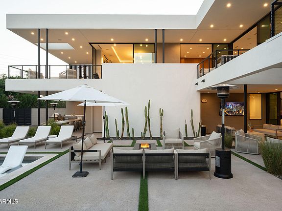 On the Arcadia/Paradise Valley border, this gated modern residence combines privacy and sophistication. A new lush ficus hedge frames the property, while floor-to-ceiling windows and sliding glass walls capture stunning views of Camelback and the Phoenix Mountain Preserve. The main level features a gourmet Wolf/Sub-Zero kitchen with hidden prep space, an open living area, and three en-suite bedrooms including a primary retreat with fireplace, spa bath, custom closet with an additional laundry unit, and private balcony. The lower level adds two en-suites, a flex room, and a full entertainment lounge with bar. Smart home automation, timeless design, and seamless indoor-outdoor living make this home ideal for both everyday living and elevated entertaining.