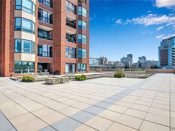 Kitchen has breakfast bar, quartz counters, stainless fridge, electric range, microwave, beverage fridge, and double stainless sink. Kitchen opens to living room and office area. Enclosed balcony. Bathroom has been completely updated and has a tub/shower combo and vanity with quartz top. Attractive laminate flooring in hallway, kitchen, and bathroom was installed in 2022. Hardwood floors were installed in 2021.The unit comes with one parking space in the secured garage and a storage space. An electric vehicle charging station was installed. Conveniently located close to downtown Buffalo with easy access to Buffalo’s medical campus.