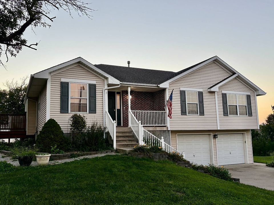 Enjoy the best of both worlds in this spacious 3-bedroom, 3-bath raised ranch, perfectly situated in a quiet neighborhood yet overlooking open countryside. Move-in ready and thoughtfully designed, this home features attractive hand scraped engineered wood floors throughout the main living areas and primary bedroom. The large living room with a welcoming fireplace and coffered ceiling flows seamlessly into an oversized dining room surrounded by floor-to-ceiling windows. Step outside to the expansive deck that wraps around two sides of the home-ideal for entertaining while taking in the country view. The kitchen offers classic oak cabinetry with a convenient laundry room nearby. Retreat to the generous primary suite with another coffered ceiling, a luxurious bath with double vanity, jacuzzi tub, separate shower, and walk-in closet. Two additional bedrooms share a full hall bath. The lower level includes a spacious family room and powder bath, plus an oversized two-car garage with workbench. With a new roof underway and a peaceful backyard view, this home truly blends comfort, style, and country charm right in town.