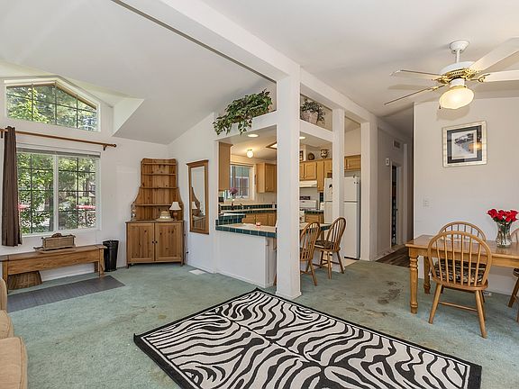 Say hello to a good buy! Wait till you see the value in this 2002 built, half log sided, 2 bed, 2 full bath single story with open floor plan, full laundry, vaulted ceilings, ceramic tile counters and large redwood decking all on a 50' x 100' level, fenced lot.