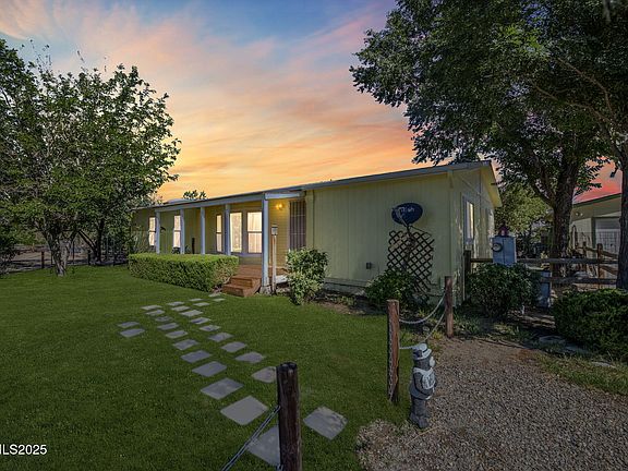 Will take backup offers! 3 Bed, 2 Bath | 1,352 Sq. Ft. | 2 Acres | RV Parking with hookups. Located in the desirable Churchill Rancho Estates in Stagecoach, this charming home features a split bedroom floor plan, brand-new roof, new windows, and wood plank flooring throughout. Built in 2000, it offers a front porch, back deck, and rain gutters. The property is fully fenced with an electric operating fence, includes a separate built in 2-car garage, RV parking with full hookups & its own septic, barn area ready for horses, fenced area for dogs or small animals, greenhouse, and storage shed. Beautifully landscaped on 2 usable acres—move-in ready and perfect for rural living!